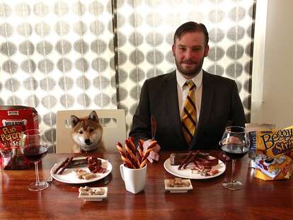 Andy's Reaction: The meat'southward a little tough, but it actually tastes like human food. Thank god! It's similar a super-salty beef jerky. I could seriously eat this whole thing. (Editor's notation: He finished the meat.)